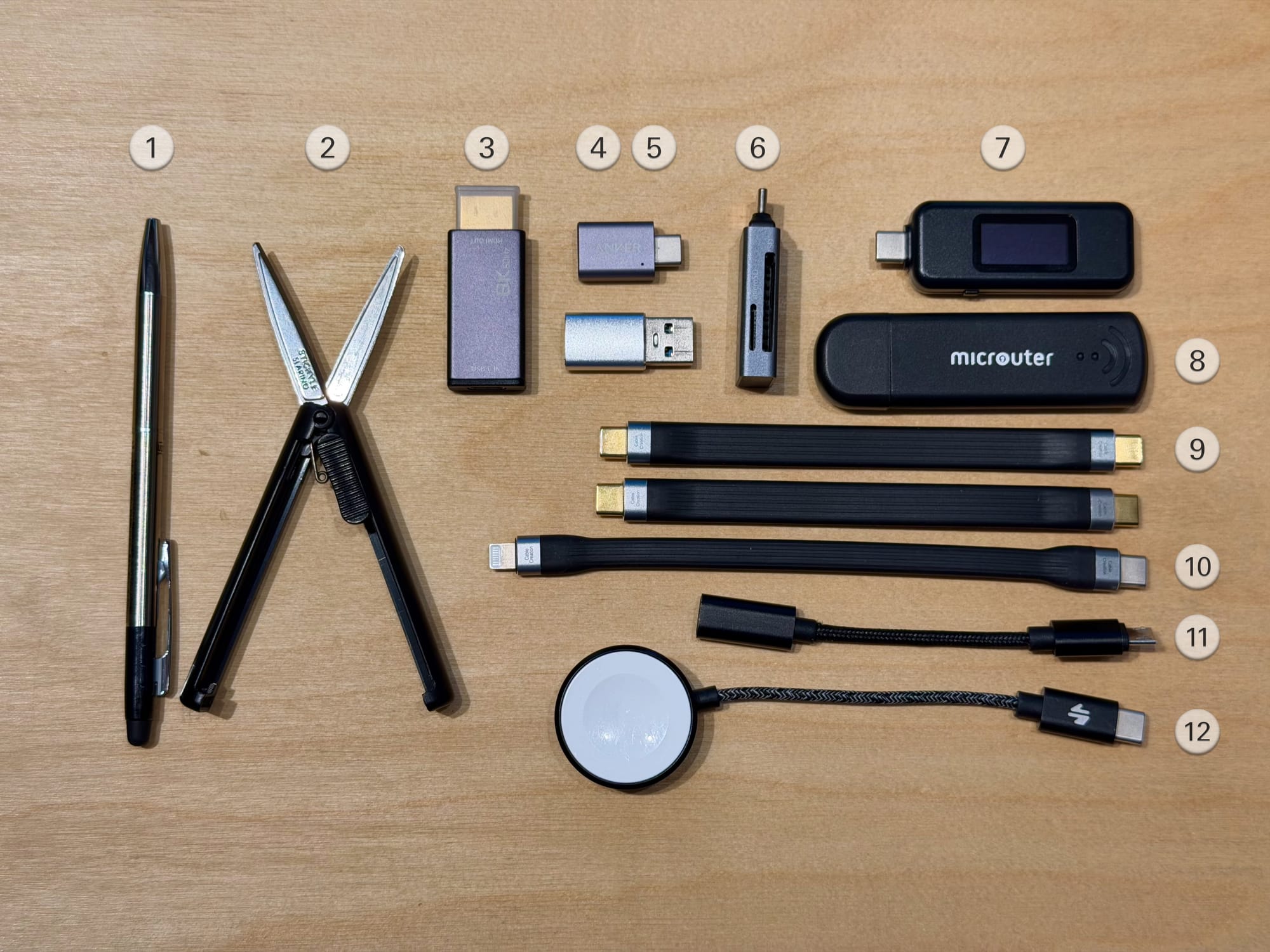 The microuter is an incredible product: a slightly-larger-than-a-flash-drive b/g/n wifi router and repeater. Any time I'm staying somewhere longer than a few nights, the Microuter comes out and gets set up to repeat the hotel or Airbnb wifi on my own network. The SSID and authentication is the same as my home network, so devices connect quickly, and Wireguard is enabled to tunnel traffic through my home router. Unfortunately, it's discontinued and nearly impossible to find, so I plan to run mine to the ground. - USB-C to USB-C 3.1 Gen 2 cables (2x)